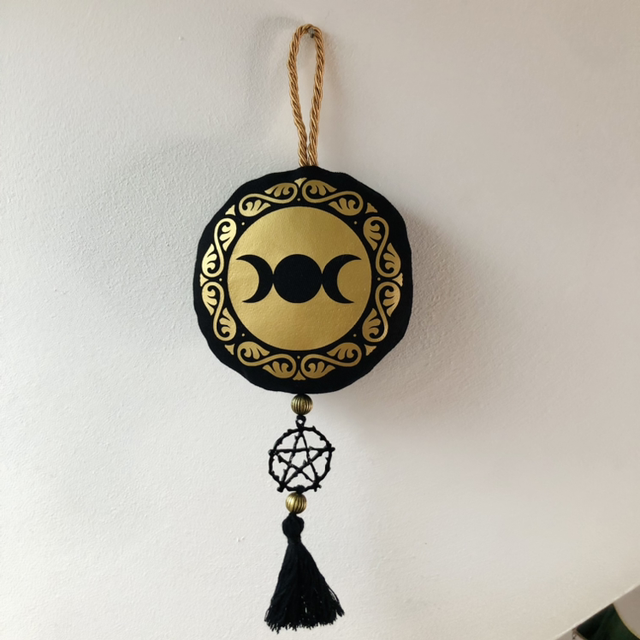 L'amulette arbore le symbole de la triple lune incarné par les trois déesses grecques Hécate, Artemis et Séléné.Symbole de cycles et de féminité, la trtriple lune représente souvent les trois phases de la vie des femmes : la jeune fille, la mère et la vieille femme.