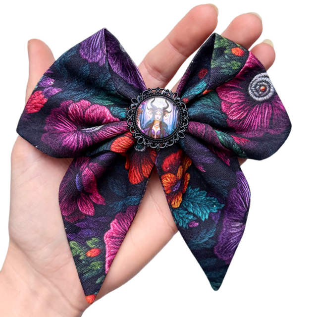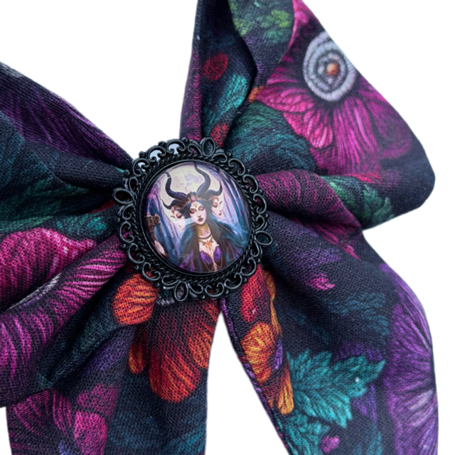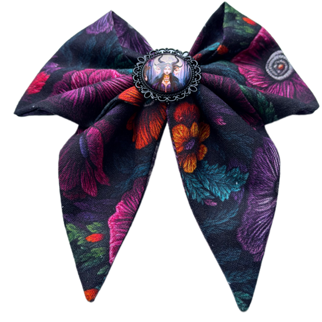 Cette barrette est inspirée de la déesse Hécate, gardienne des mystères et des carrefours. Son nœud dans des tons violets profonds évoque la nature sacrée, la sagesse ancienne et la puissance féminine.