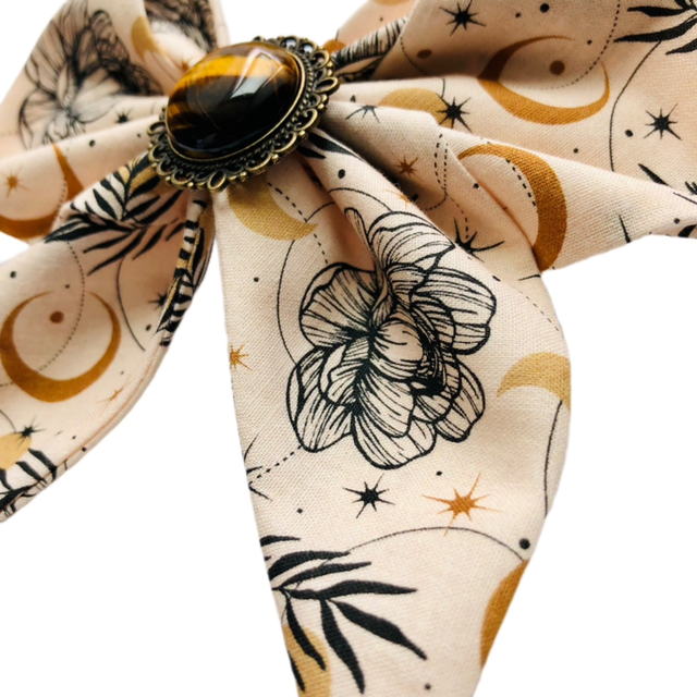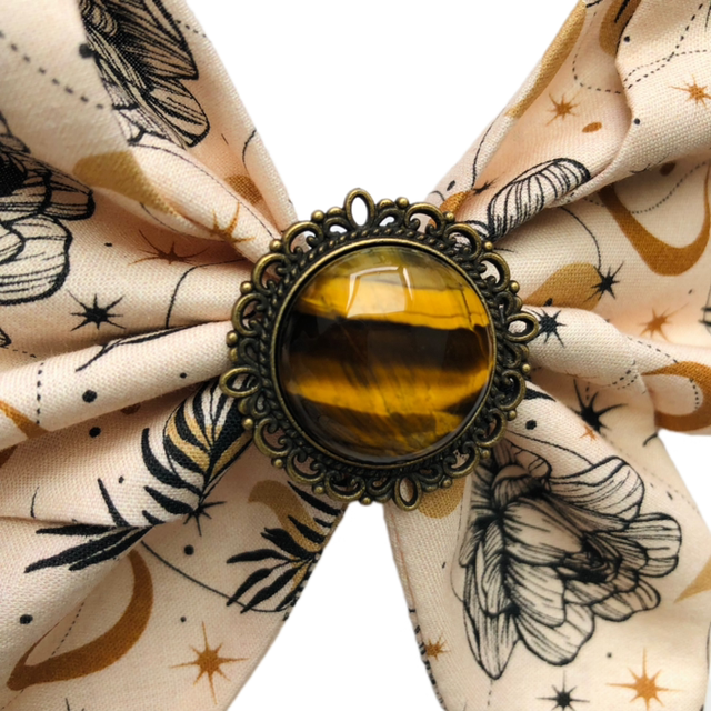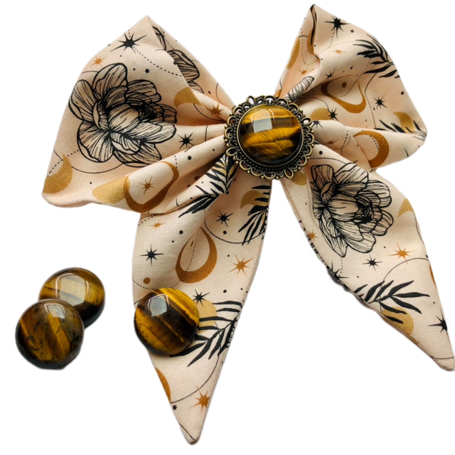 Cette barrette est bien plus qu’un simple accessoire : c’est un talisman énergétique à porter dans tes cheveux. L’Œil de Tigre, pierre de protection et de force intérieure, agit comme un bouclier contre les énergies négatives, tout en réveillant confiance et clarté. Associée au symbole lunaire, elle devient un bijou de cheveux ésotérique, à la fois protecteur et lumineux.