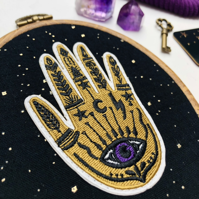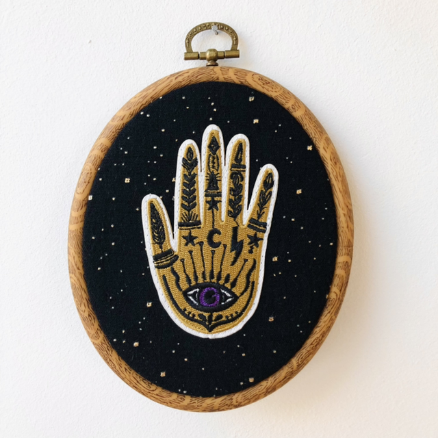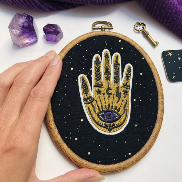 Ce cadre met en lumière la main mystique, symbole ancestral de protection et de divination. Sur fond étoilé, une paume dorée se dresse, ornée d’un œil violet vibrant : l’œil intérieur, messager de clairvoyance et d’intuition spirituelle. Éclairs, étoiles et motifs ésotériques gravés dans la main rappellent la puissance des énergies invisibles et la guidance de l’univers.