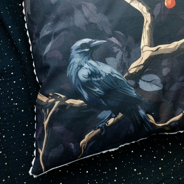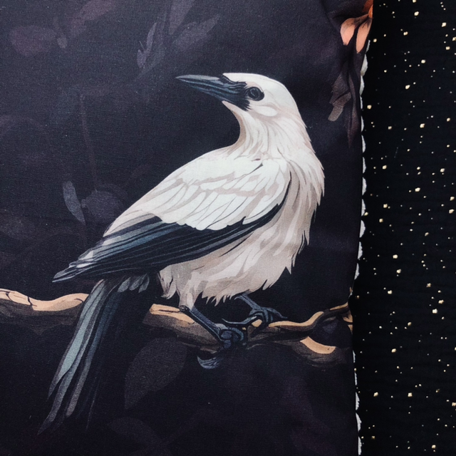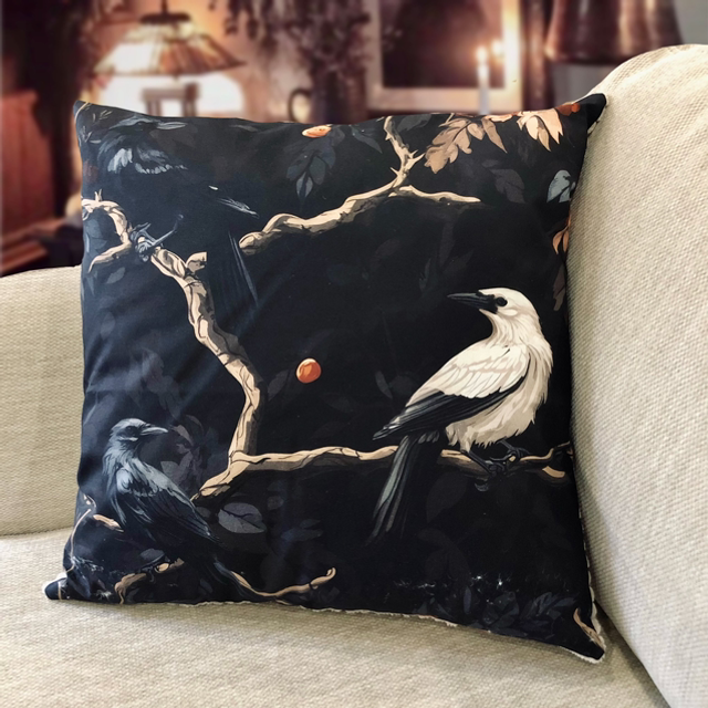 Plonge dans une ambiance mystérieuse avec ce coussin au charme énigmatique, parfait pour ajouter une touche sombre et poétique à ton intérieur. Le motif présente un corbeau blanc, l’oiseau sacré d’Apollon, symbole de pureté et de clairvoyance. Selon la légende, il devint noir après avoir rapporté une mauvaise nouvelle. L’envers en velours côtelé blanc apporte douceur et confort et rappelle la couleur du plumage . Plus qu’un simple coussin, c’est un objet déco emprunt de mythologie