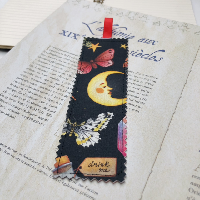 Ce marque-page artisanal n’est pas qu’un simple accessoire : c’est un talisman pour tes lectures. Réalisé en tissu rigidifié, il garde une souplesse agréable qui lui permet de se glisser facilement dans tes livres tout en restant résistant. Sur un fond nocturne s’illumine une lune bienveillante, symbole de cycles et d’intuition, accompagnée d’un papillon messager de transformation. Le flacon mystérieux orné de l’inscription “drink me” évoque les portes de l’imaginaire, rappelant les élixirs mystiques et les rituels witchy.