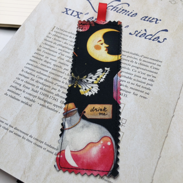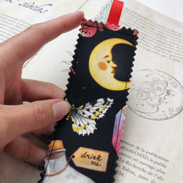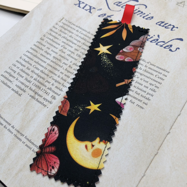 Ce marque-page artisanal n’est pas qu’un simple accessoire : c’est un talisman pour tes lectures. Réalisé en tissu rigidifié, il garde une souplesse agréable qui lui permet de se glisser facilement dans tes livres tout en restant résistant. Sur un fond nocturne s’illumine une lune bienveillante, symbole de cycles et d’intuition, accompagnée d’un papillon messager de transformation