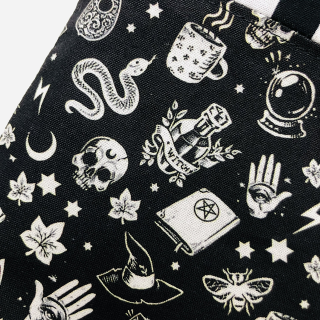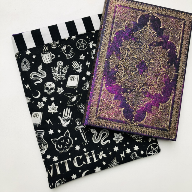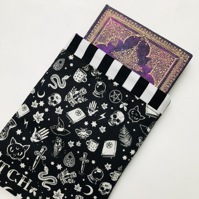 Cette pochette à livre de poche est bien plus qu’un simple accessoire : c’est une bulle de magie pour tes lectures. Son tissu noir orné de symboles ésotériques – grimoires, pentacles, serpents, crânes, lunes et chats mystiques – t’invite à voyager dans un univers witchy et spirituel. Les rayures contrastées lui apportent une touche alternative et unique, entre mode mystique et magie quotidienne.