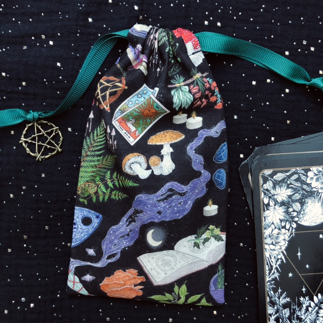 Ce pochon mystique est conçu pour garder précieusement tes cartes d’oracles, tes cristaux ou tout autre talisman. Son imprimé vibrant dévoile un univers ésotérique : champignons sacrés, fougères protectrices, tarot, pentacle et astres… Chaque détail résonne comme un symbole de magie, de guidance et de connexion spirituelle.