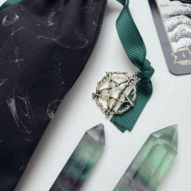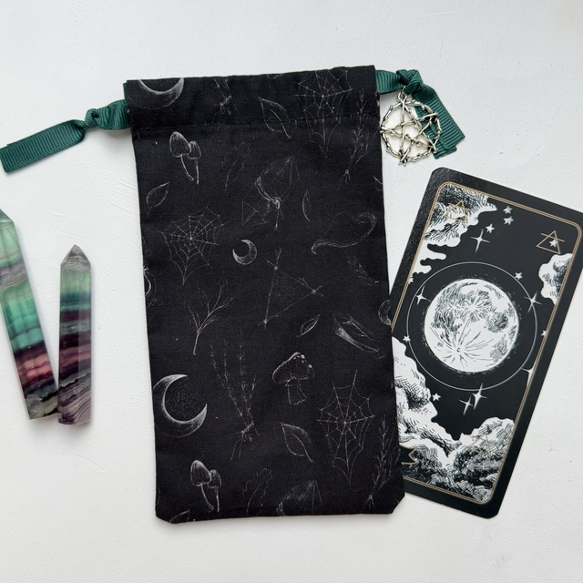 Un pochon au fond sombre, orné de motifs évoquant le monde des sorcières païennes