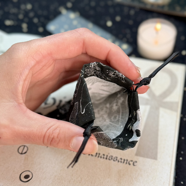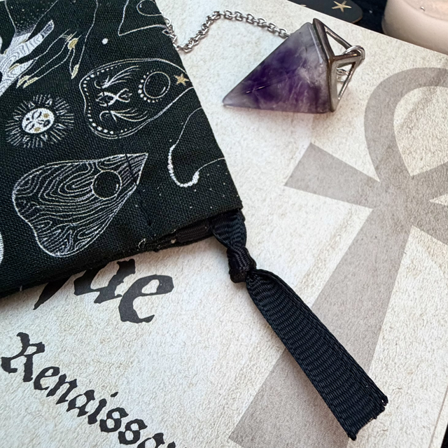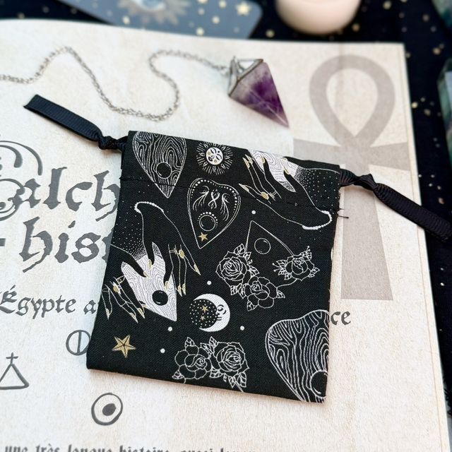 Ce petit pochon en tissu est conçu pour ranger tes pendules ou autres objets précieux avec élégance et soin. Son design inspiré de thèmes ésotériques et mystiques apporte une touche poétique et mystérieuse à ton rangement, tout en protégeant tes objets avec douceur.