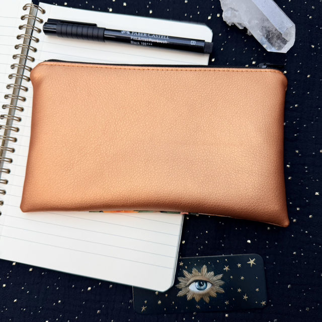 Confectionnée en simili cuir et tissu coton imprimé, cette trousse allie symbole et douceur. Sa doublure intérieure soigneusement posée garantit solidité et belle tenue. Parfaite pour ranger tes accessoires, ton maquillage ou tes petits talismans du quotidien.