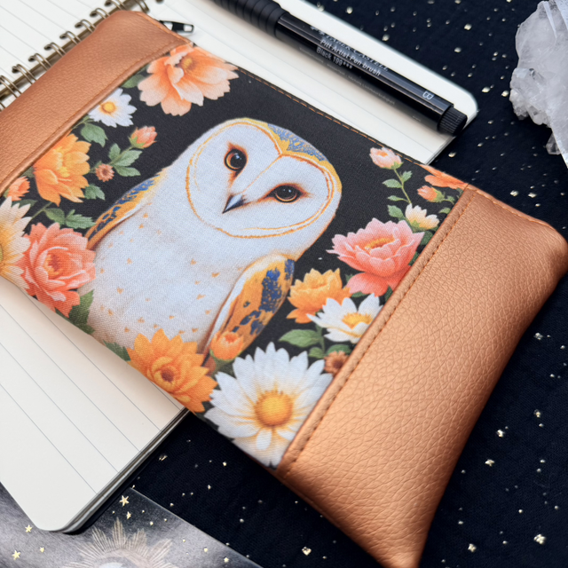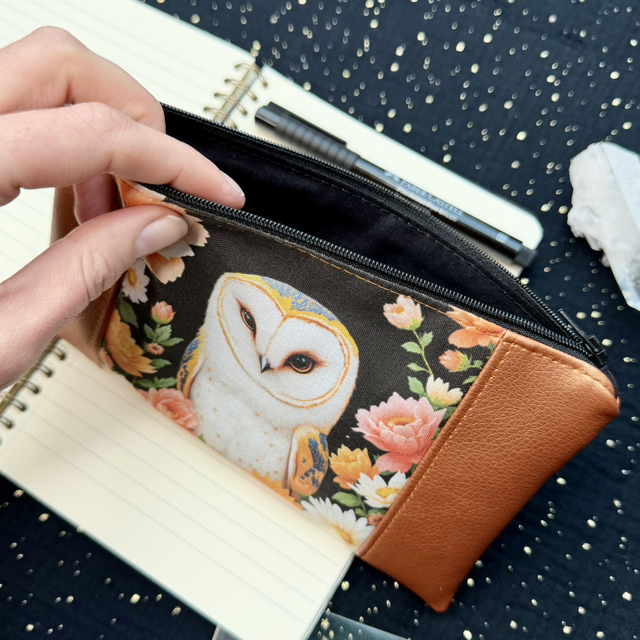 Laisse la sagesse silencieuse de la chouette t’accompagner avec cette trousse, une création profondément symbolique.