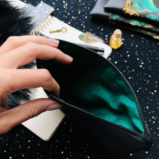 Confectionnée en simili cuir noir et tissu coton imprimé, cette trousse associe style et protection. Sa doublure intérieure soigneusement posée garantit solidité et belle tenue. Parfaite pour ranger tes accessoires, ton maquillage ou tes petits talismans du quotidien.