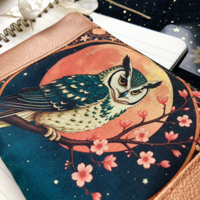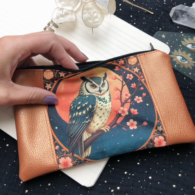 L'hibou, messager des mondes invisibles, incarne la sagesse, la clairvoyance et la protection. Cette trousse arbore un hibou stylisé aux yeux lumineux, symbole d'intuition et de guidance spirituelle.