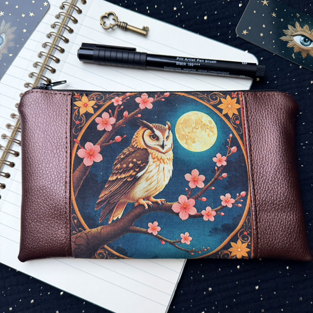 L'hibou, messager des mondes invisibles, incarne la sagesse, la clairvoyance et la protection. Cette trousse arbore un hibou stylisé aux yeux lumineux, symbole d'intuition et de guidance spirituelle.