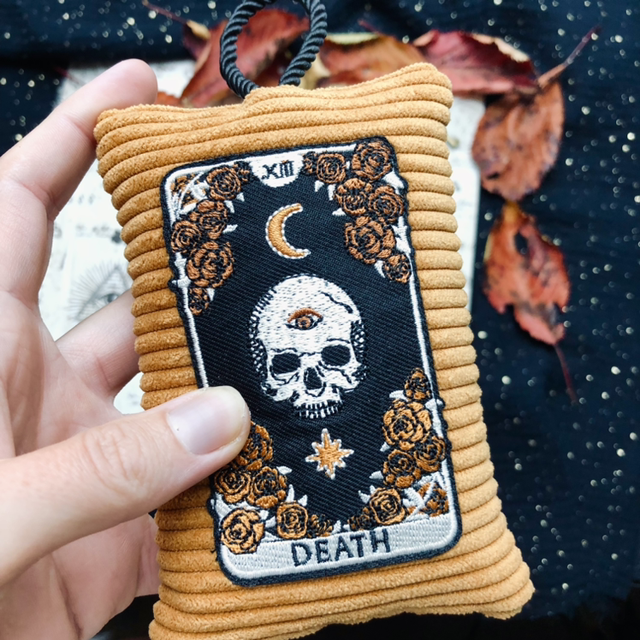 Brodée sur un doux velours, cette amulette incarne l’Arcane XIII du Tarot, également connue sous le nom de « La Mort ». Symbole de fin nécessaire et de renaissance inévitable, elle t’invite à lâcher prise pour accueillir la magie d’un futur en gestation.